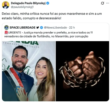 A nova declaração foi feita em uma publicação sobre a prisão do prefeito de Turilândia, Paulo Curió, e da primeira-dama Eva Curió. Na postagem, o parlamentar descreveu o Maranhão como um estado “corrupto, falido e desnecessário”.