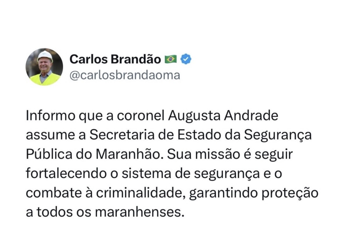 O governador do Maranhão, Carlos Brandão, anunciou na tarde desta terça-feira (17) a coronel Maria Augusta de Andrade Ribeiro como nova titular da Secretaria de Estado da Segurança Pública (SSP-MA).