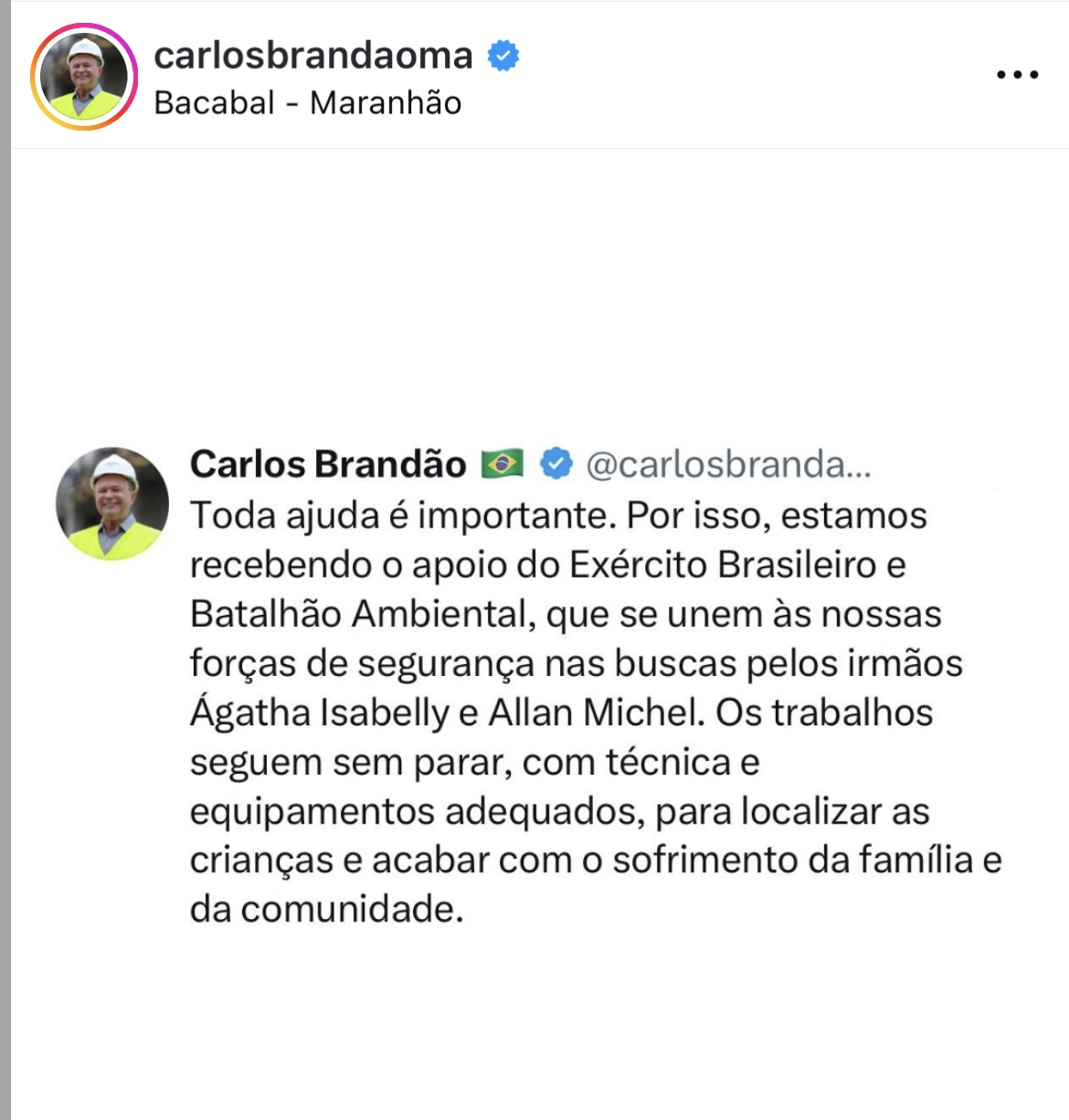 O governador do Maranhão, Carlos Brandão, anunciou nesta sexta-feira (9) o reforço do Exército Brasileiro e do Batalhão Ambiental nas buscas pelas crianças Ágatha Isabelly e Allan Michel, desaparecidas no município de Bacabal.