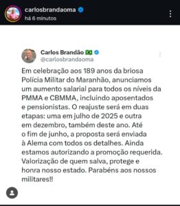 Em comemoração aos 189 anos da Polícia Militar do Maranhão (PMMA), o governador Carlos Brandão (PSB) anunciou, nesta segunda-feira (17), um reajuste salarial para todos
