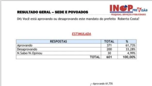 Uma pesquisa realizada pelo instituto Inop na semana passada mostra que o prefeito de Bacabal , Roberto Costa (MDB), está com a aprovação em