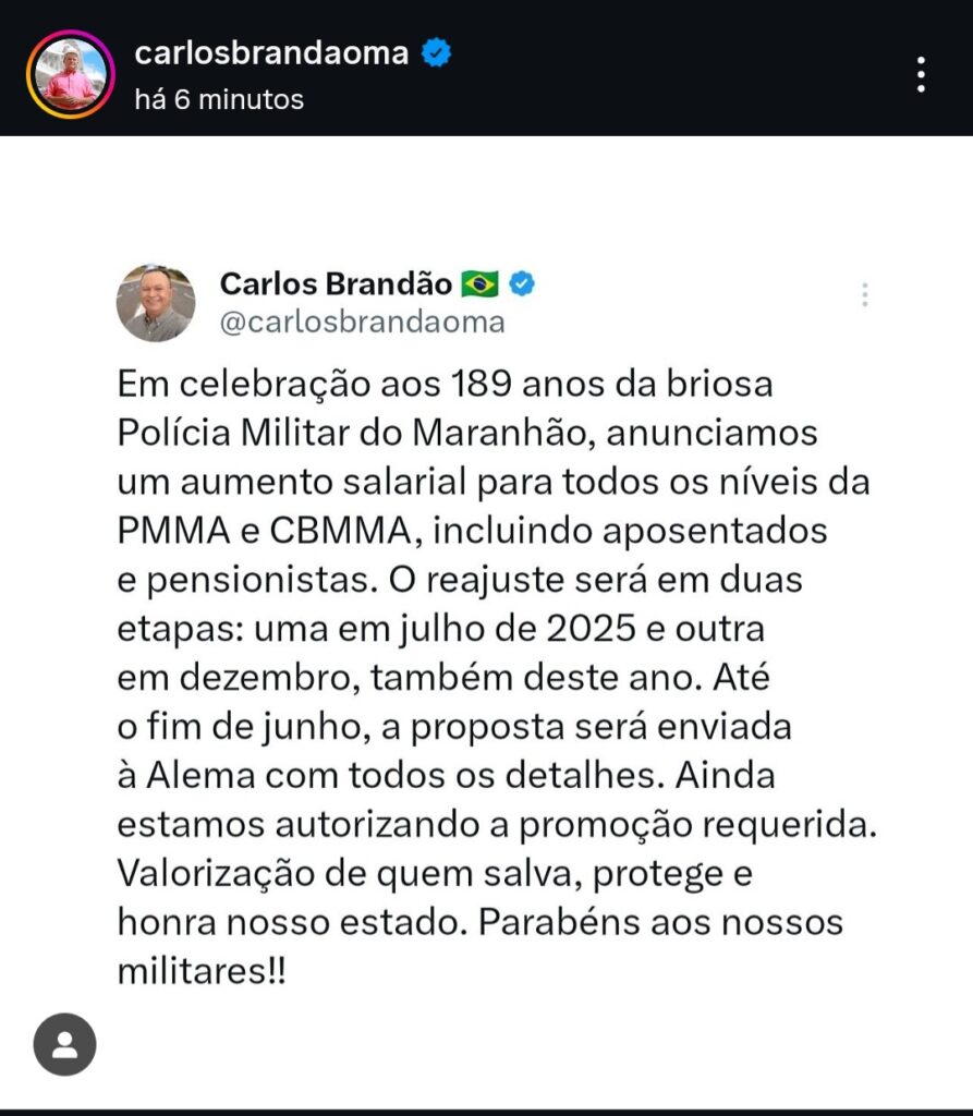 Em comemoração aos 189 anos da Polícia Militar do Maranhão (PMMA), o governador Carlos Brandão (PSB) anunciou, nesta segunda-feira (17), um reajuste salarial para todos os níveis da corporação e do Corpo de Bombeiros Militar do Maranhão (CBMMA). A medida também contempla aposentados e pensionistas.