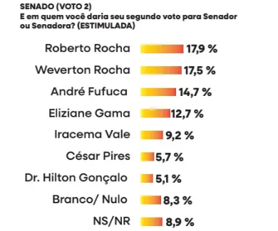Somando os votos do primeiro e do segundo voto válidos, o cenário para o Senado se apresenta com Weverton Rocha (23,8%) liderando, seguido de Roberto Rocha (22,0%), André Fufuca (17,6%) e Eliziane Gama (16,1%). Iracema Vale aparece com 10,3%, Dr. Hilton Gonçalo tem 5,2%, e César Pires 5,0%.