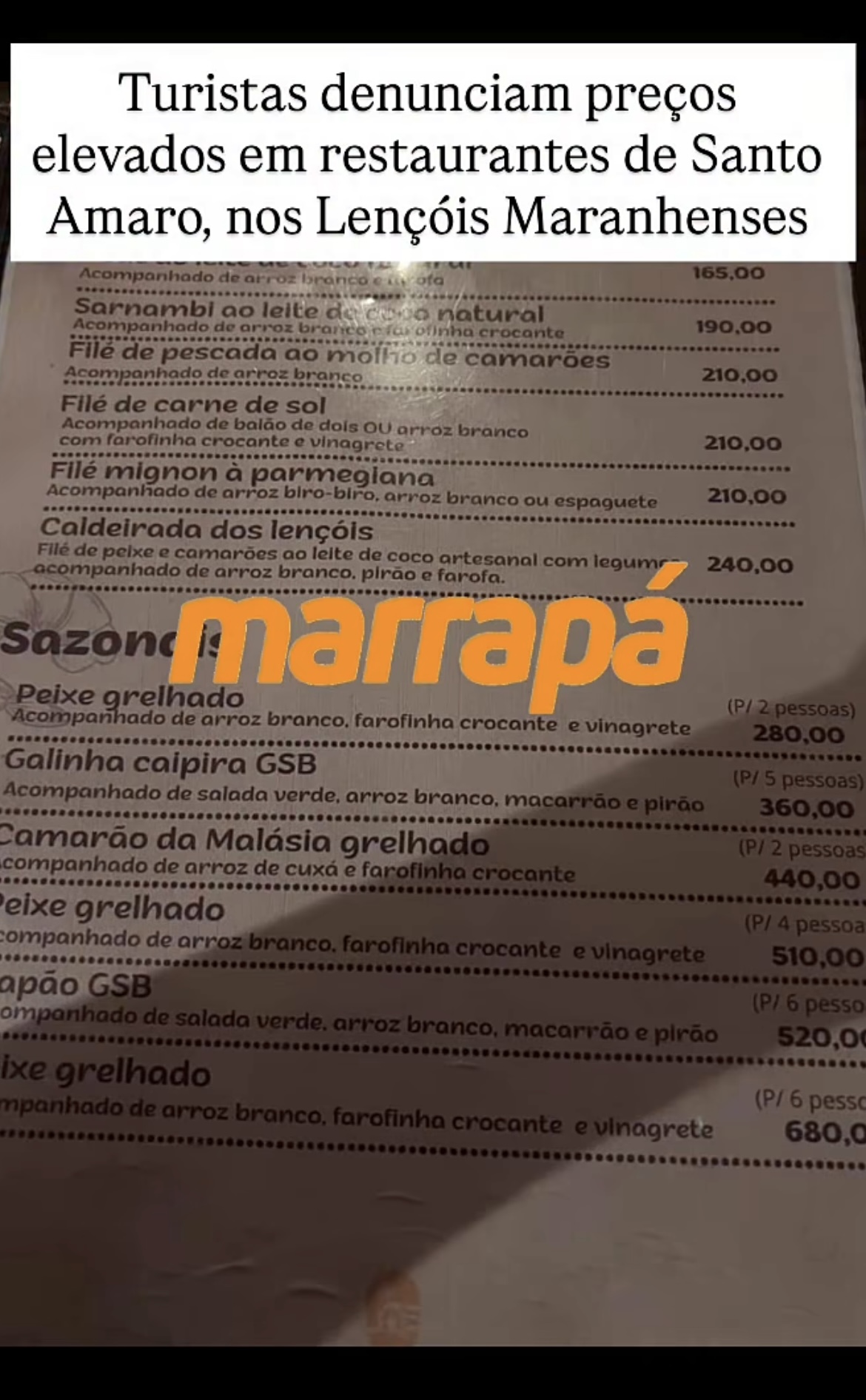 Outros preços também chamaram atenção dos turistas. O filé-mignon à parmegiana chega a R$ 210, enquanto o sarnambi ao leite de coco, vendido em São Luís por cerca de R$ 90, é ofertado em Santo Amaro por R$ 190.